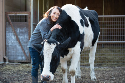 Upon entering Rancho Compasión, a farm animal sanctuary, goats, pigs, and geese alike run up to sniff out visitors and say hello. Oliver the pig happily grunts along, seemingly unaware that he narrowly escaped the fate of being auctioned off as a luau pig at an equine fundraiser by being bid on by a good Samaritan who wanted to spare him that demise. Angel the cow, who according to Miyoko Schinner became a diva on the ranch after becoming an Internet sensation when a YouTube video of her falling asleep on someone’s lap went viral, slowly lumbers along, looking for her best friend on the ranch, a goose.