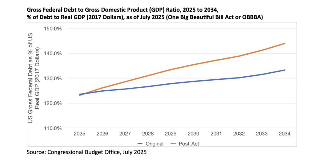 The accompanying graphic (below) represents the latest (as of July 2025) projection by the Congressional Budget Office for the annual change through 2034, with respect to new federal debt entering the market. The federal debt-to-Gross Domestic Product (GDP) ratio is expected to increase as deficits create more debt during a time of slow economic growth. One implication of this progression is that by 2034, one in every six dollars of federal government revenue will be allocated to interest payments on the federal debt.