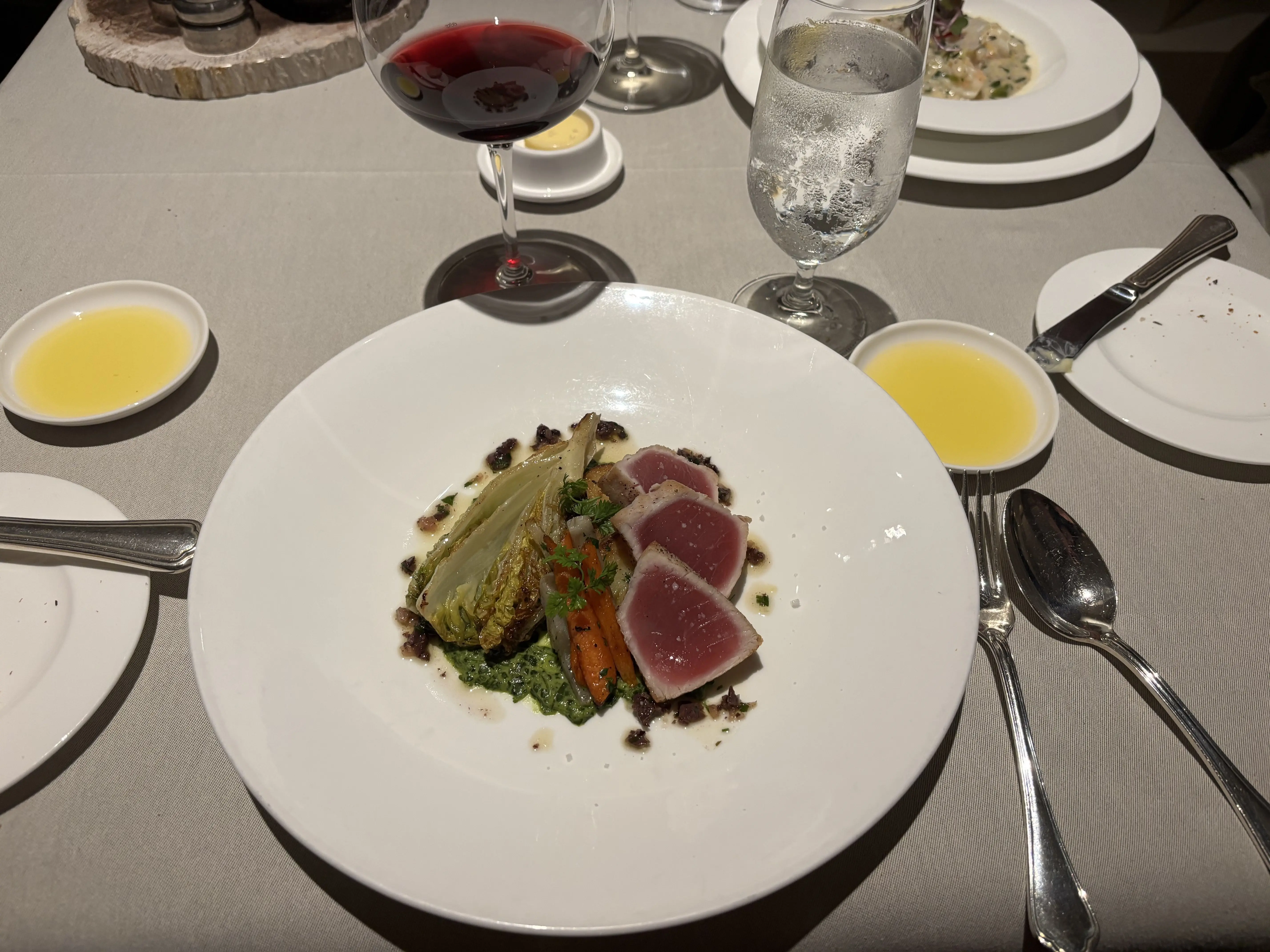 Next came the yellowfin tuna, served alongside grilled little gems, herb tahini, fingerling potatoes and Taggiasca olives. The tuna was pristine, its clean flavor enhanced by the smoky char of the greens and the richness of the tahini. A 2021 Grenache from Gallica’s Rossi Ranch in Sonoma Valley brought a soft, fruit-forward contrast, adding depth without overpowering the dish’s more delicate elements.