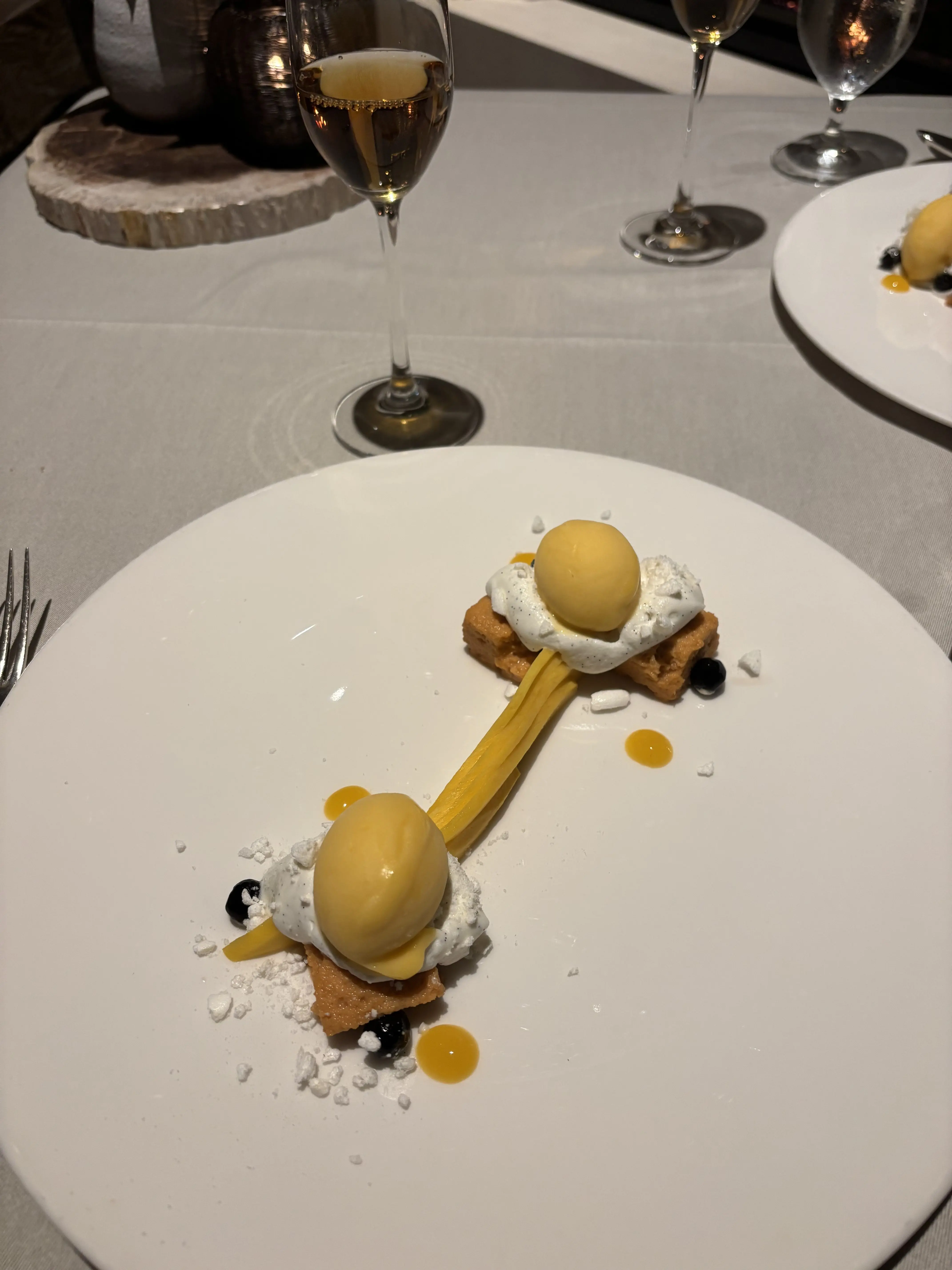 mango, vanilla chantilly and boba pearls. Light yet indulgent, it offered a tropical brightness that rounded out the meal without feeling heavy. Paired with a 2021 Vidal Icewine from Inniskillin in Canada’s Niagara Peninsula, the wine echoed the dessert’s sweetness while adding a lush, honeyed finish.